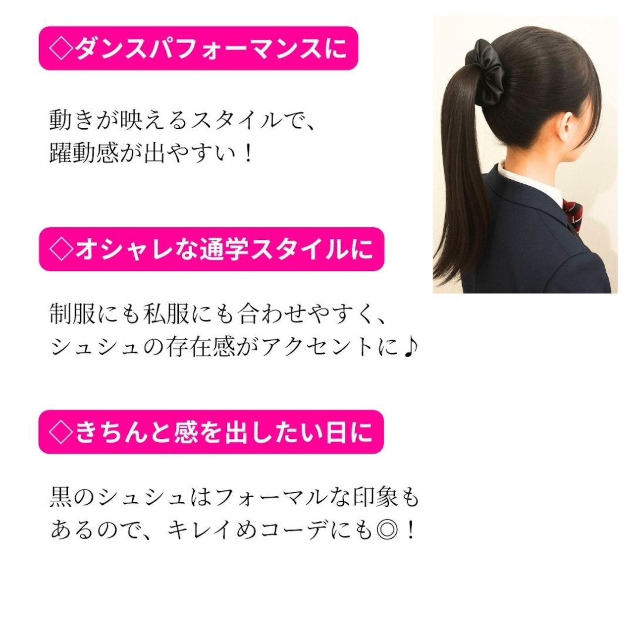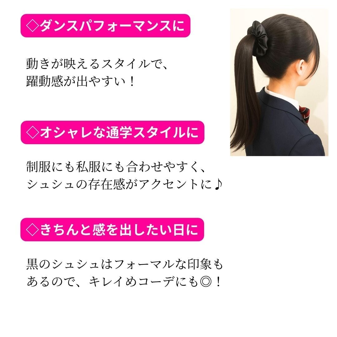 シンプルで大人っぽいデザインが特長で、ダンスや発表会、通学時のヘアスタイルにも最適!