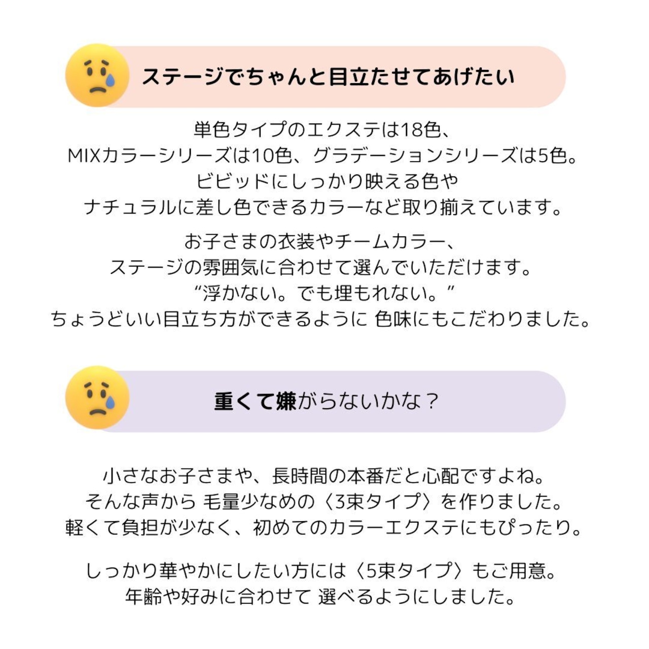 ◇当店オリジナルのエクステです。こちらの商品は5束のエクステンションより毛量が少ないため、小さなお子様や、ツインテールなどのヘアアレンジにおススメです。