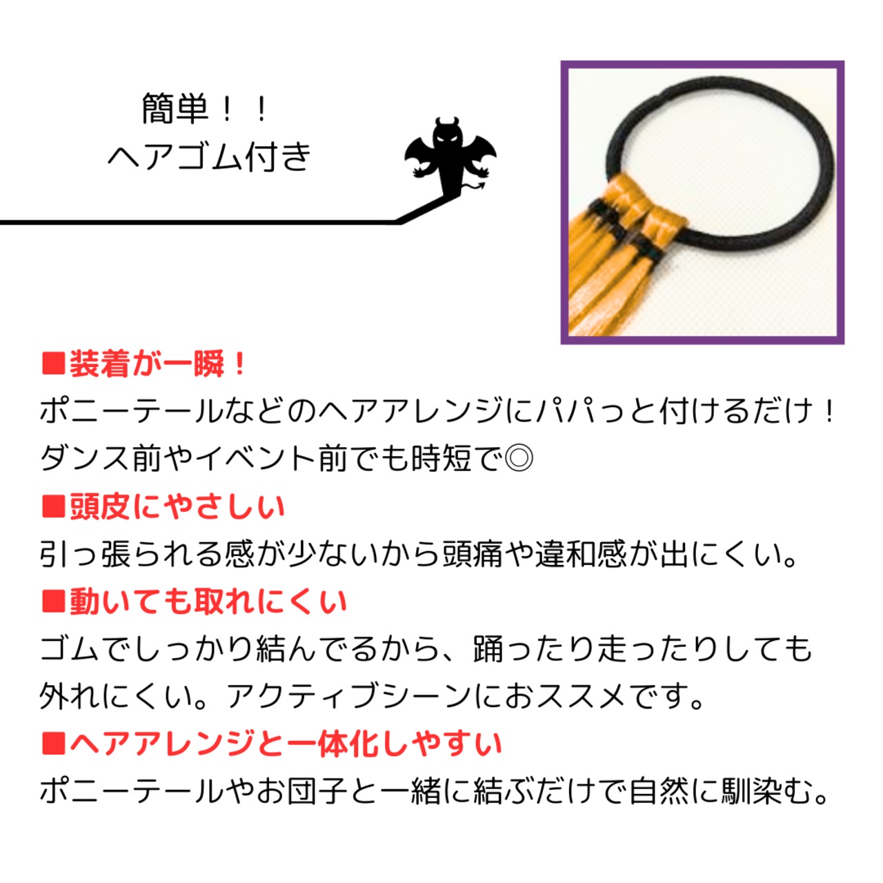 ゴム付きで簡単に装着できるので、忙しい時でもサッとスタイルチェンジが可能です。