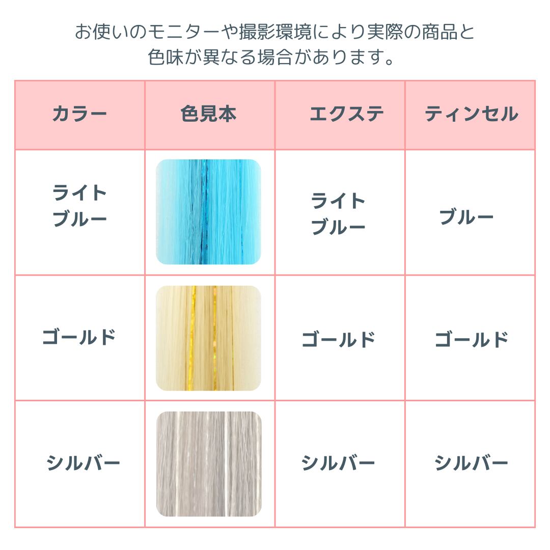 ※1つのゴムにエクステ(ティンセル入り)が3束付いています。