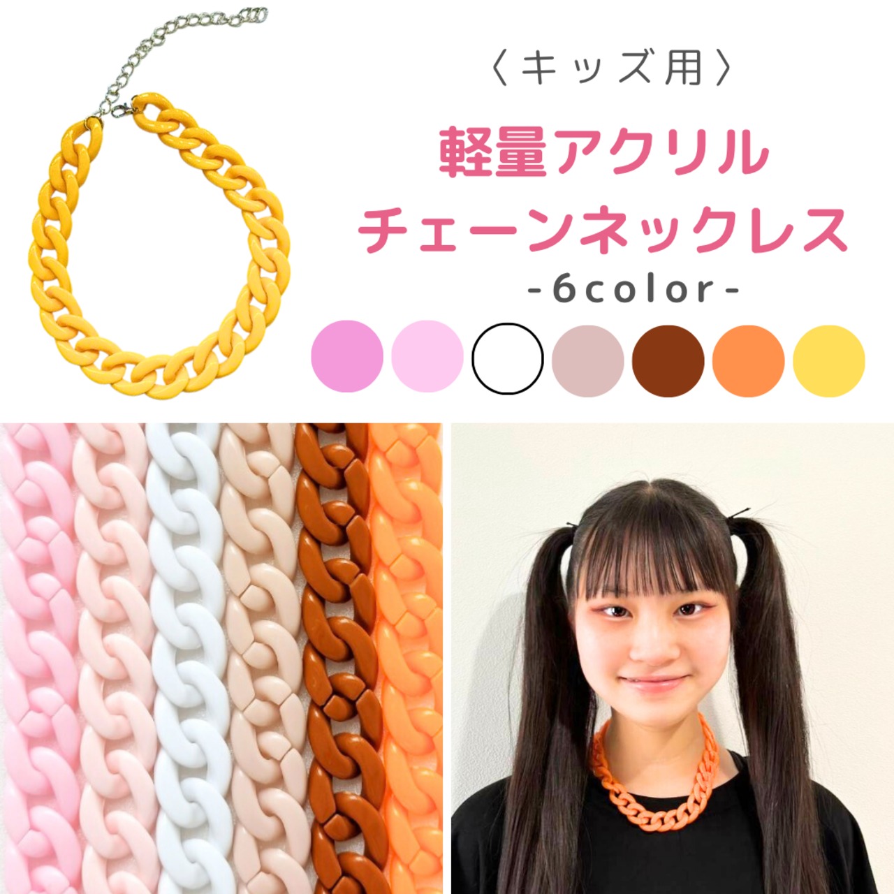 可愛らしい6色展開のキッズ用チェーンネックレスは、軽量で使い勝手抜群!